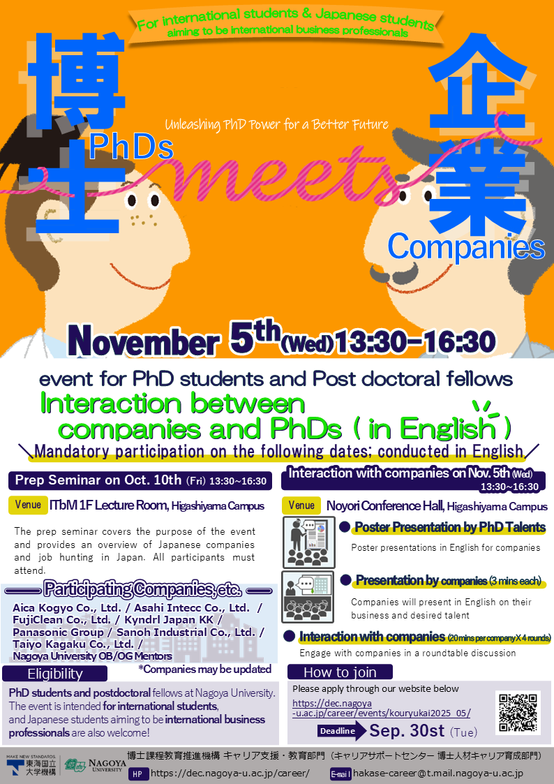 The main target audience is doctoral students who wish to work in Japan, but Japanese doctoral students who aim to become international businesspersons are also welcome to participate.