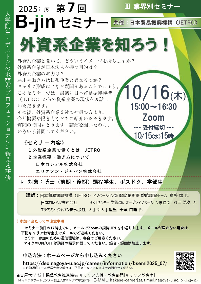 このセミナーでは、日本貿易振興機構(JETRO)から外資系企業の現状をお話しいただきます。そして、外資系企業2社(日本ロレアル株式会社、エリクソン・ジャパン株式会社)の社員の方より、会社概要と働き方などをご紹介いただきます。質問の時間もとります。講演を聞いたのち、いろいろ質問してください。