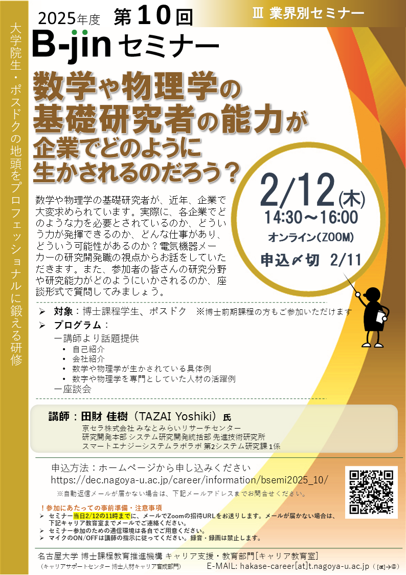 数学や物理学の基礎研究者が、近年、企業で大変求められています。実際に、各企業でどのような力を必要とされているのか、どういう力が発揮できるのか、どんな仕事があり、どういう可能性があるのか?電気機器メーカーの研究開発職の視点からお話をしていただきます。