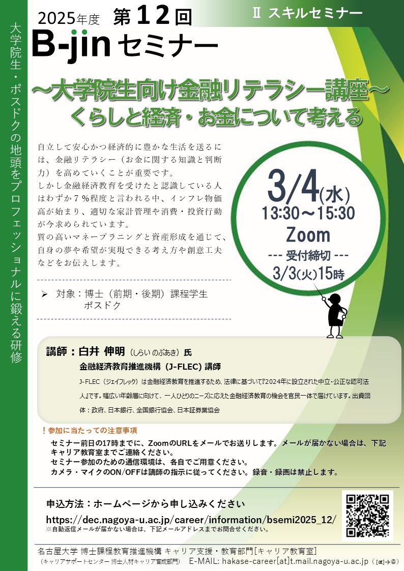 「~大学院生向け金融リテラシー講座~くらしと経済・お金について考える」を開催します。