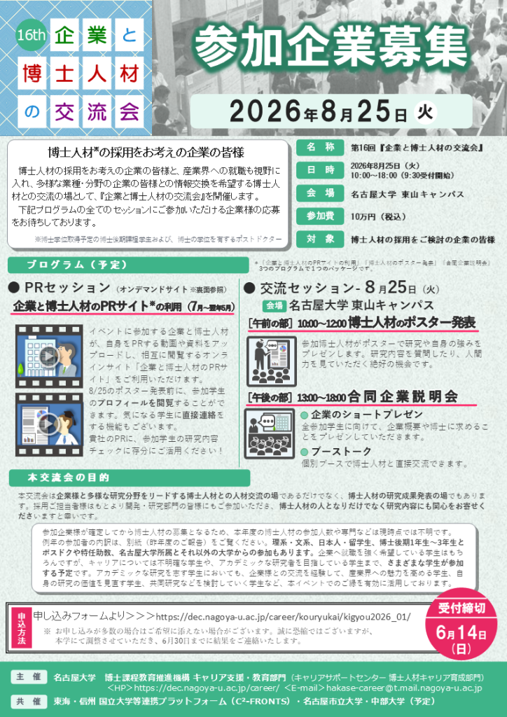 主催:名古屋大学 博士課程教育推進機構 キャリア支援・教育部門(キャリアサポートセンター博士人材育成部門)共催:東海・信州 国立大学等連携プラットフォーム(C²‐FRONTS)・名古屋市立大学・中部大学(予定)