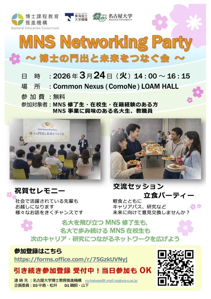 Whether you are graduating from MNS and embarking on a new journey beyond Nagoya University, or continuing your doctoral path here, this event is designed to expand networks that connect you to your next career and research opportunities.