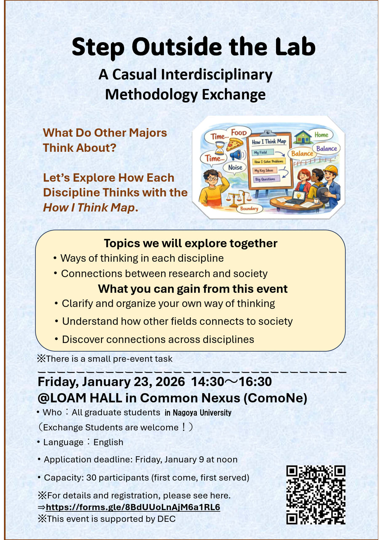 本イベントは、大学院生が研究室の外に一歩踏み出し、研究について少し違った形で語り合うカジュアルな交流イベントです。