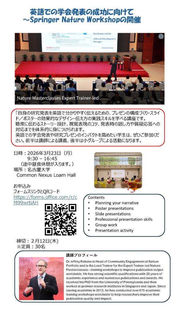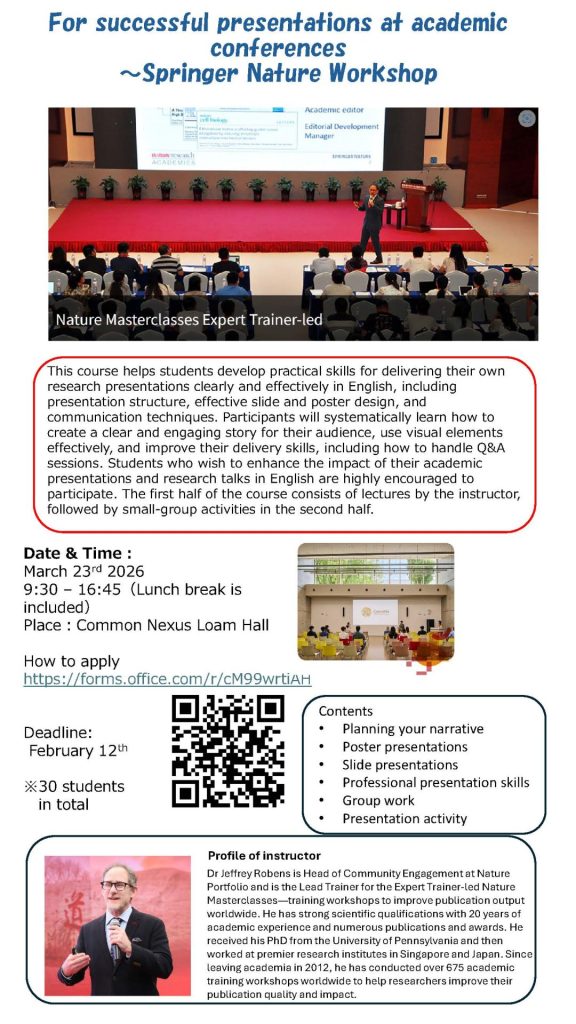 Through this workshop, you will learn a wide range of practical tips for successful academic presentations, including oral and poster presentations.