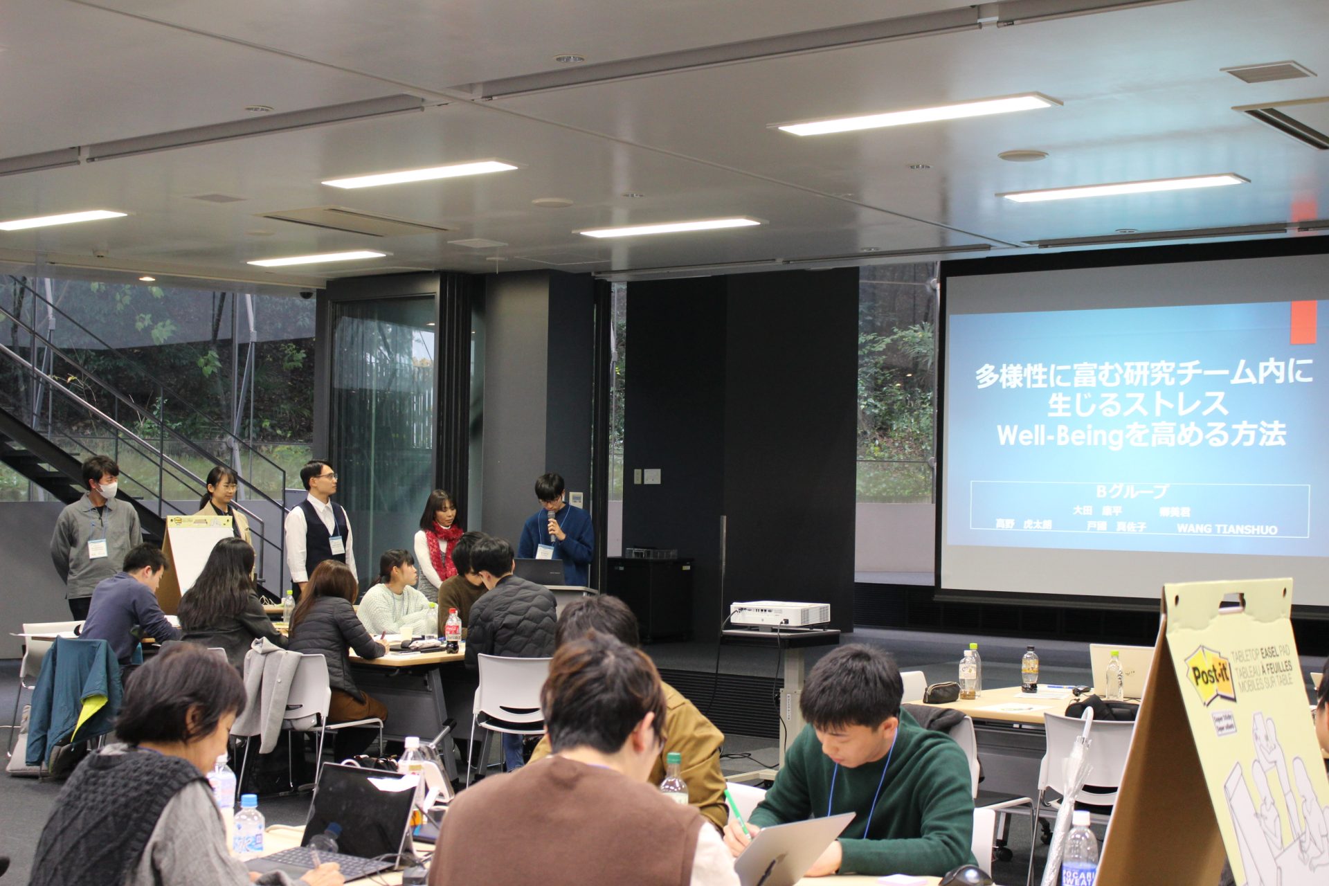 11月25日・26日に他大学博士との交流イベントを行いました。新潟大学・立命館大学・名古屋大学・神戸大学・北海道大学の5大学から32名の博士課程学生が参加し、大学間、異分野間の交流を積極的に行いました。今年度は名古屋大学が幹事校となって野依記念学術交流館で行われました。学生は、6グループに分かれ、今年度のテーマである「各自の研究を融合しWell-Being実現に向けた取り組みを考えよう」についてディスカッションを行いました。