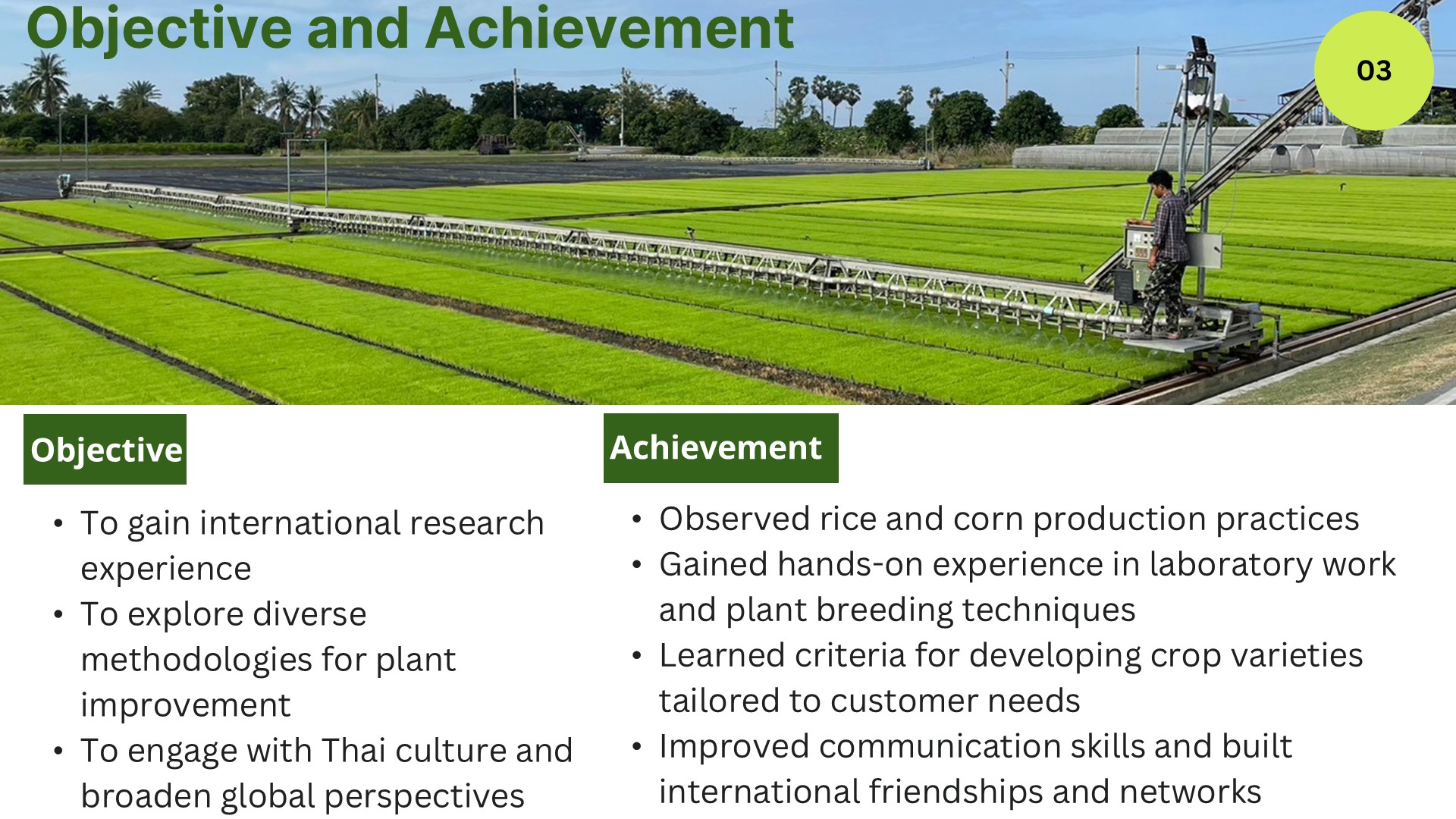 現地の大学院生とともに、タイの農業について座学及びフィールドワークを行う。穀物生産についての知見を深めると同時に、グループワーク等を通しタイの学生との交流を深めたり、現地の教授とのネットワーク作りなど大変実りある体験であったことを発表してくれました。