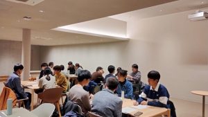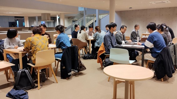 11月25日(火) 10:30-12:00 東山キャンパスにて英語サロンを開催しました。今回は、夏に新しくオープンしたComoNe内のLOUNGEを利用し、オープンな環境下で初めての実施となりました。時折、行き交う方が足を止めてこちらを見る中、学生たちはくつろぎつつ集中して英会話を楽しんでいました。今回は16名の学生が参加し、自己紹介の後、博士課程ならではの外国語の学び方や壁に直面した時にどう乗り越えるのか、といったトピックを取り上げました。本活動では、MNS次世代研究事業に採択された英語の堪能な博士後期課程がディスカッションパートナーとして、小グループでの会話をリードすると共に、メンバー交代や参加学生のコメント発表時にフォローするなど、ファシリテーターとしても運営に携わりました。