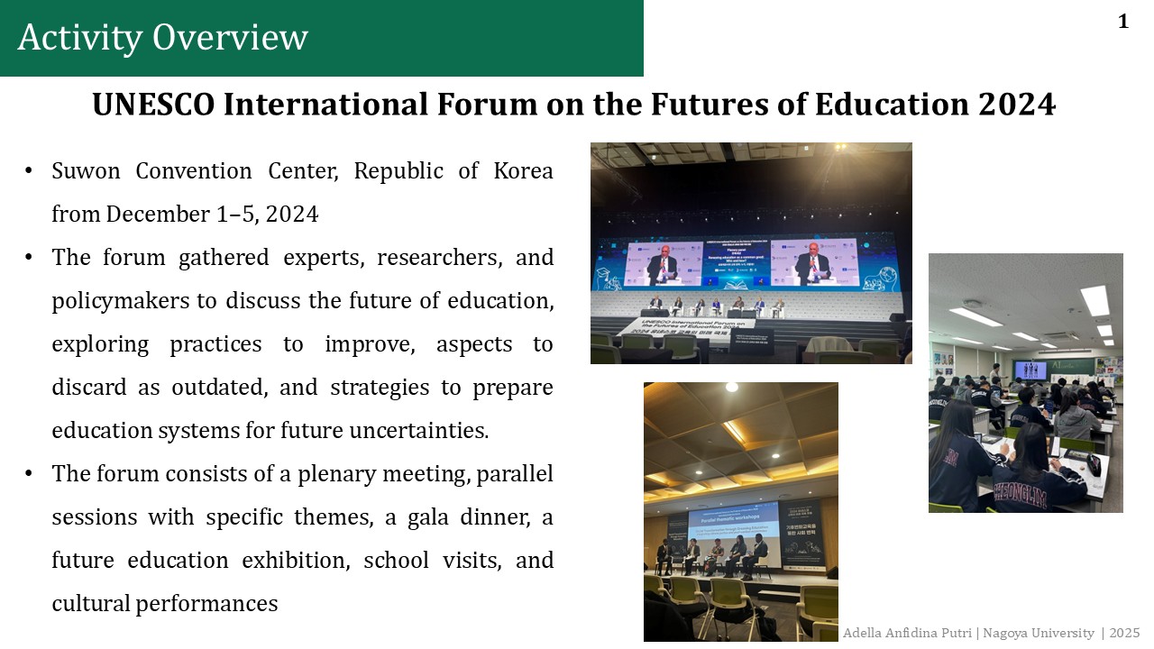 She participated in the UNESCO International Forum on the Futures of Education 2024, a three-day event held in South Korea.