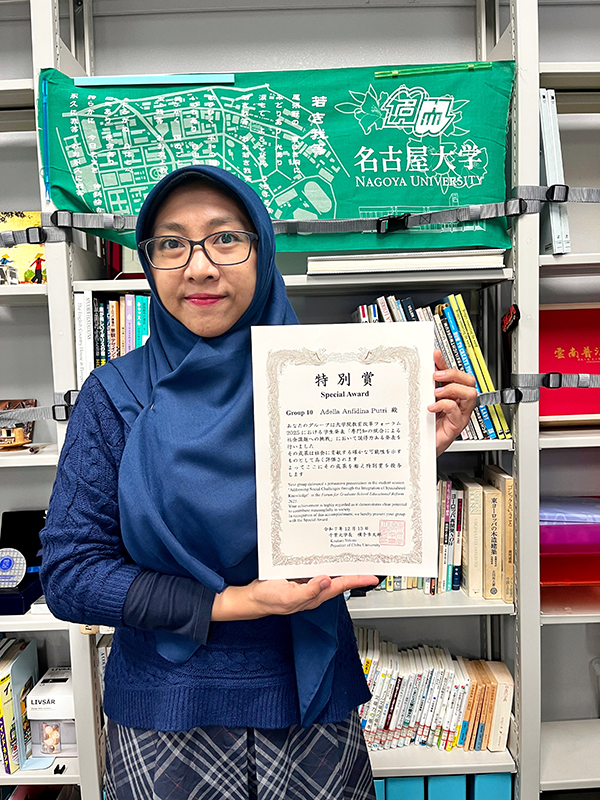 Adella Anfidina Putri was awarded Special Award at the Forum for Graduate School Educational Reform 2025 for the group presentation titled “Addressing Social Challenges through the Integration of Specialized Knowledge”. Congratulations!