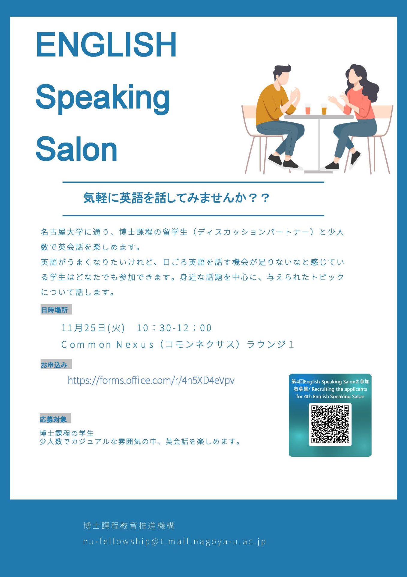 英語がうまくなりたいけれど、日ごろ英語を話す機会が足りないなと感じている博士課程の学生さんは是非この機会に参加ください。