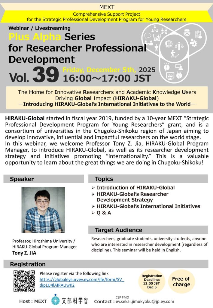 本イベントでは、HIRAKU-Globalプログラム・マネージャーのTony Z. Jia先生をお迎えし、HIRAKU-Globalのご紹介とプログラム内の「国際性」にフォーカスした取組についてご講演いただきます。